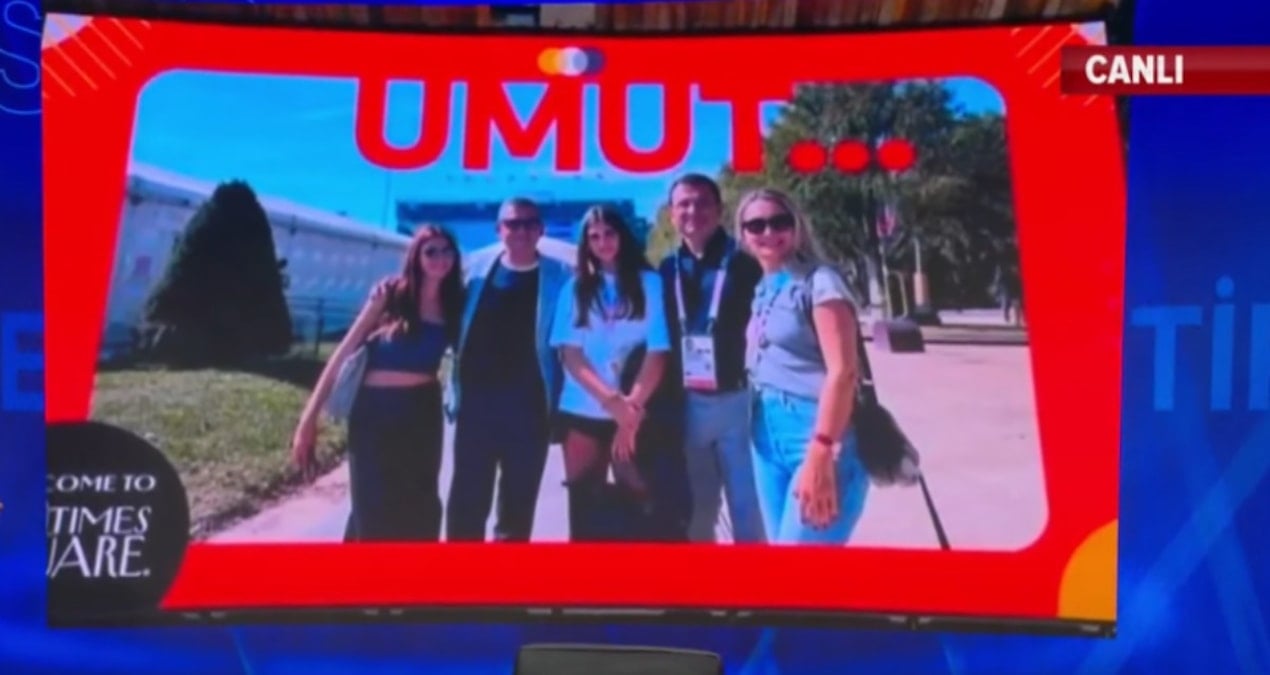 “New York’ta karşılama hazırlandı. Times Meydanı’nda dev ekranda Türk diasporası ve gençler özellikle bir fotoğraf bulmuşlar. Fotoğrafta Ekrem İmamoğlu ve eşi, kızları, Özgür Özel ve onun kızı var ve üzerine de umut yazılmış. Bu fotoğrafla bir ilan vermişler ve umut yazmışlar ve Erdoğan’ı bu fotoğraf karşılıyor”